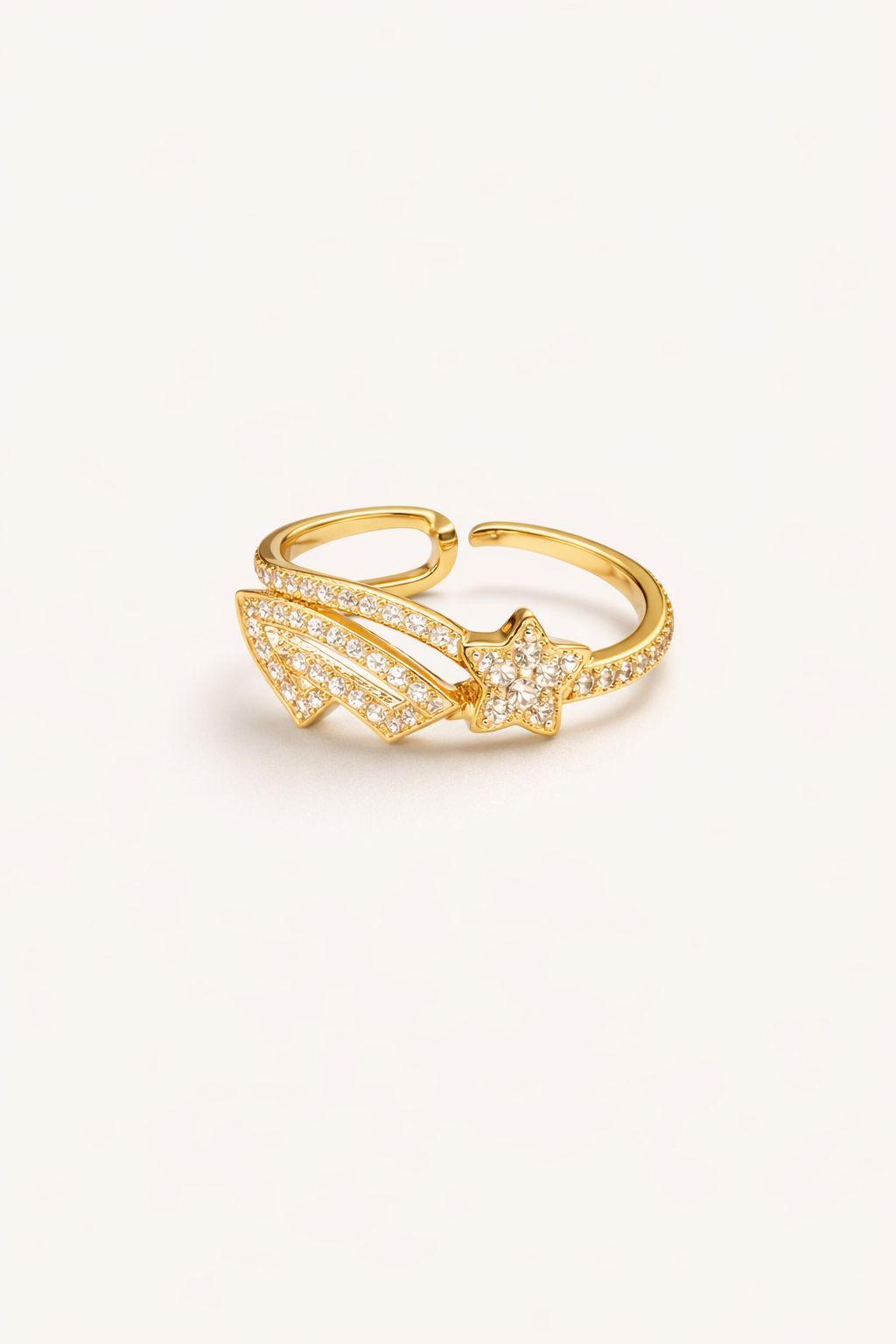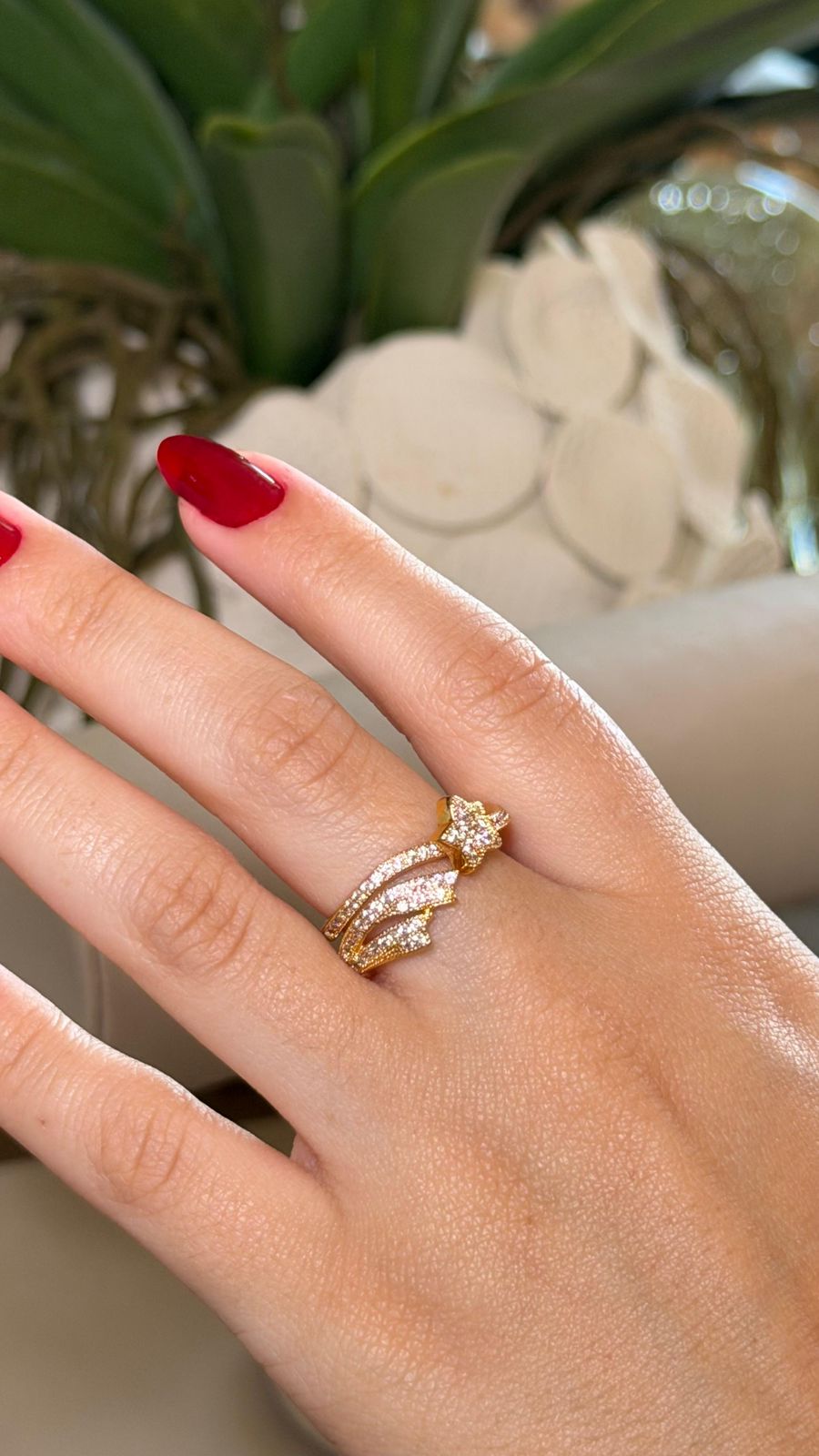 Anel Estelar Ajustável: design feminino e contemporâneo que une delicadeza e atitude. A peça apresenta uma pequena estrela acompanhada de um rastro estilizado — ambos totalmente cravejados em microzircônias — apoiados sobre um aro aberto e regulável, que permite ajuste confortável e versátil a diferentes dedos. O banho em ouro 24k oferece um tom quente e acabamento espelhado que valoriza o brilho das pedrinhas, transformando o anel em um acessório perfeito tanto para uso diário quanto para ocasiões especiais. Leve e anatômico, é ideal para quem busca uma peça charmosa, com apelo lúdico e acabamento joalheiro.