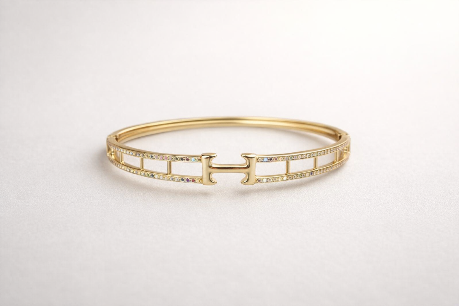 Elegante e contemporâneo, o Bracelete H Cravejado destaca-se pelo seu design sofisticado e minimalista. A estrutura delicada em formato aberto é valorizada por linhas de microzircônias multicoloridas que percorrem a peça, criando um brilho sutil e refinado.