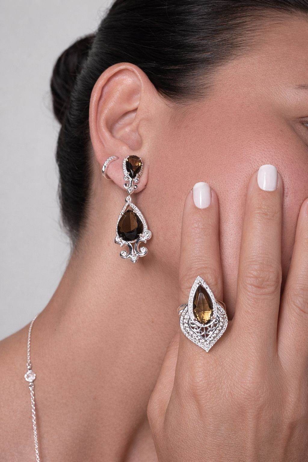 O anel espelha o motivo gota: uma gema fumê central, ladeada por trabalho filigranado e contornos cravejados que valorizam o volume e o brilho. O acabamento prateado polido realça o contraste entre o metal e o tom quente da gema, resultando em um conjunto de forte apelo formal e visual de alta joalheria.