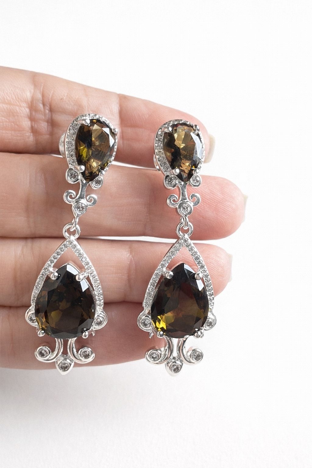 O brinco apresenta duas gotas facetadas em tom fumê (uma menor na base do lóbulo e outra maior como pendente) montadas em estrutura ornamentada com arabescos e fileiras de microzircônias que capturam a luz a cada movimento.
