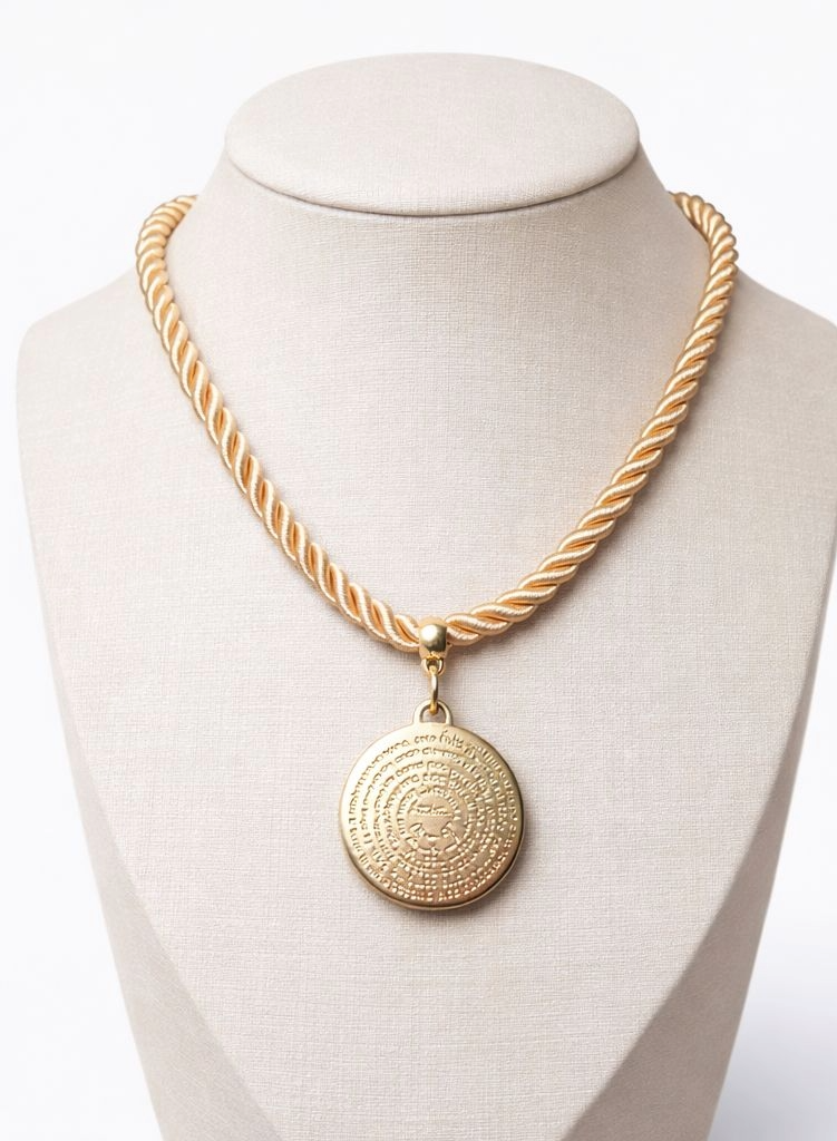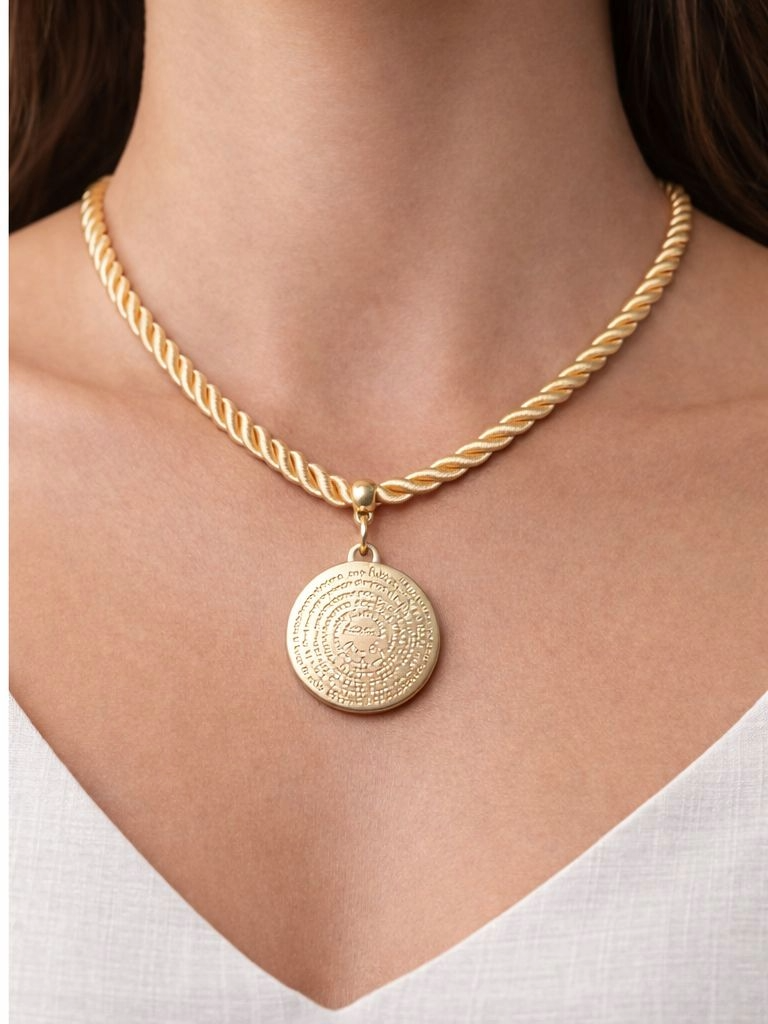 Peça com forte significado afetivo e espiritual, o cordão fita traz um visual delicado e contemporâneo combinado com um pingente dourado gravado com a oração “Pai Nosso”. Oferece brilho caloroso e acabamento refinado, enquanto o design em trama de fita de cetim da corrente confere leveza e acabamento discreto apropriado para uso diário ou ocasiões especiais. Ideal para quem busca uma joia com valor simbólico, como presente religioso, lembrança de fé ou acessório de devoção pessoal.