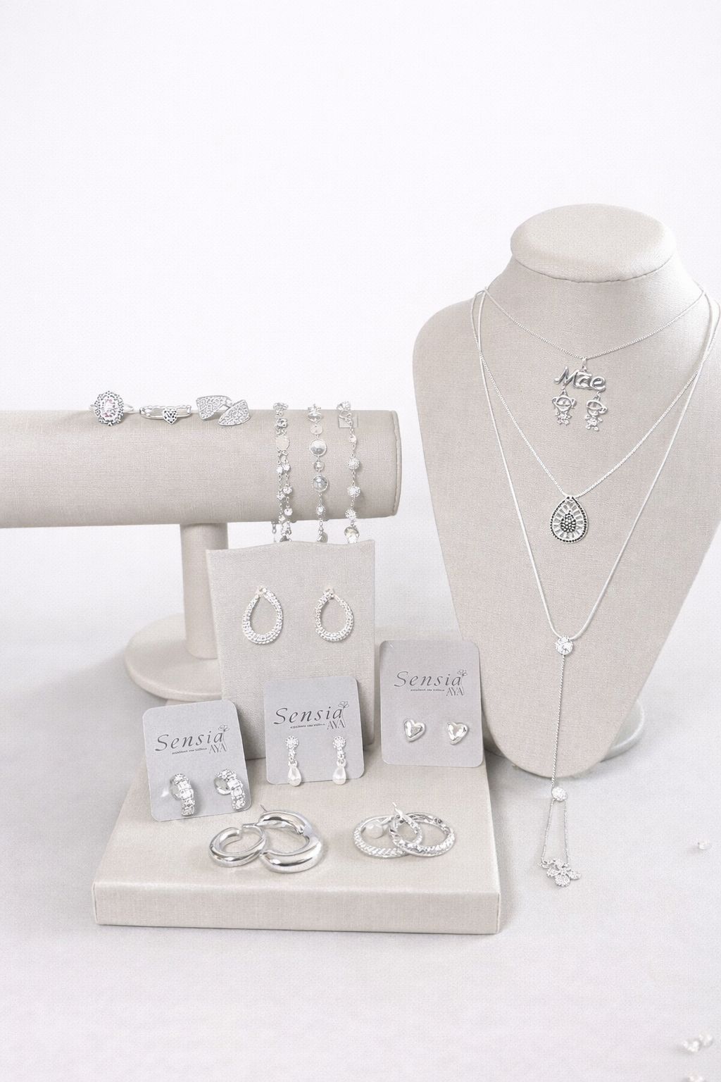 3 brincos pequenos, 3 brincos grandes, 3 pulseiras, 3 colares com pingente e 3 anéis (tamanhos diversos) — todas embaladas individualmente e Tag personalizada Sensia Aya, prontas para você vender.